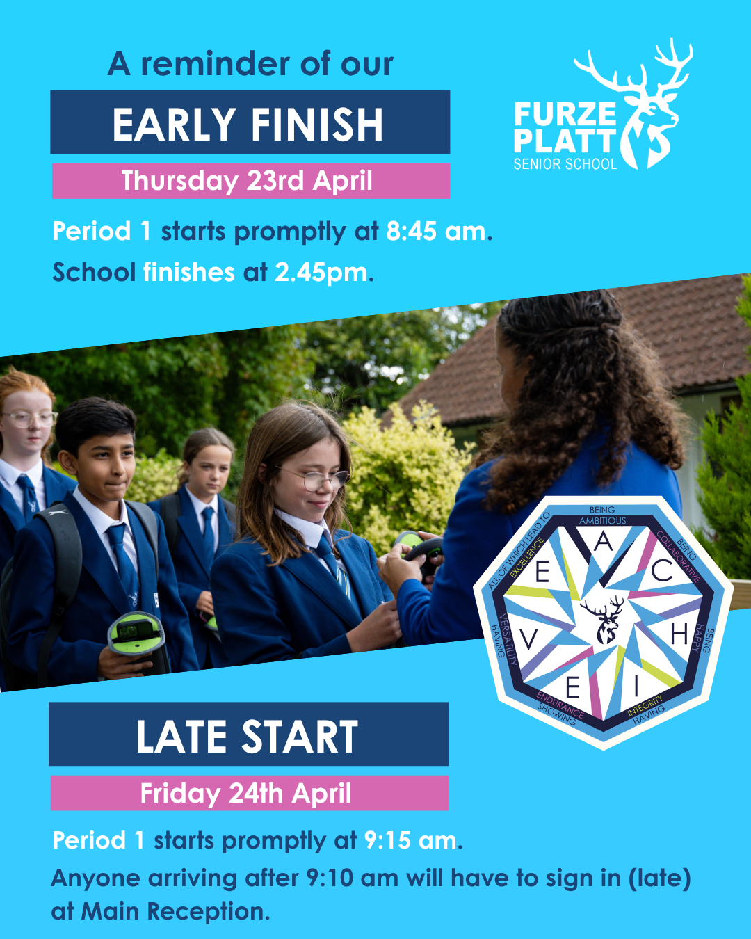 This will be followed by a late start of 9.15am on Friday 24th April. Students should go directly to their first lesson at 9.15am; there will be no Form Time on Friday.