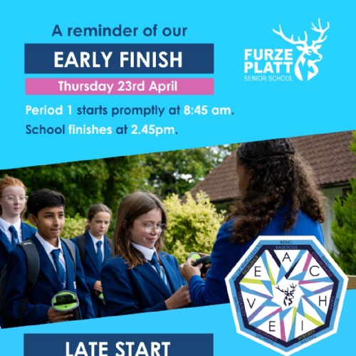 In preparation for our Year 7 Parents’ Evening this Thursday 23rd April, school will finish early at 2.45pm on that day.