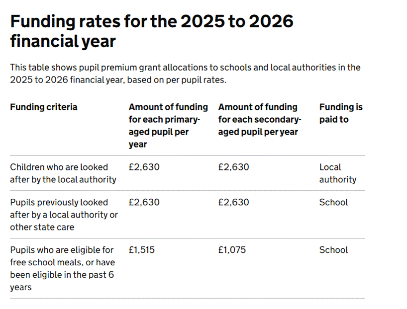 This table shows how the pupil premium grant is allocated to schools and local authorities in financial year 2025-26, based on per pupil rates.