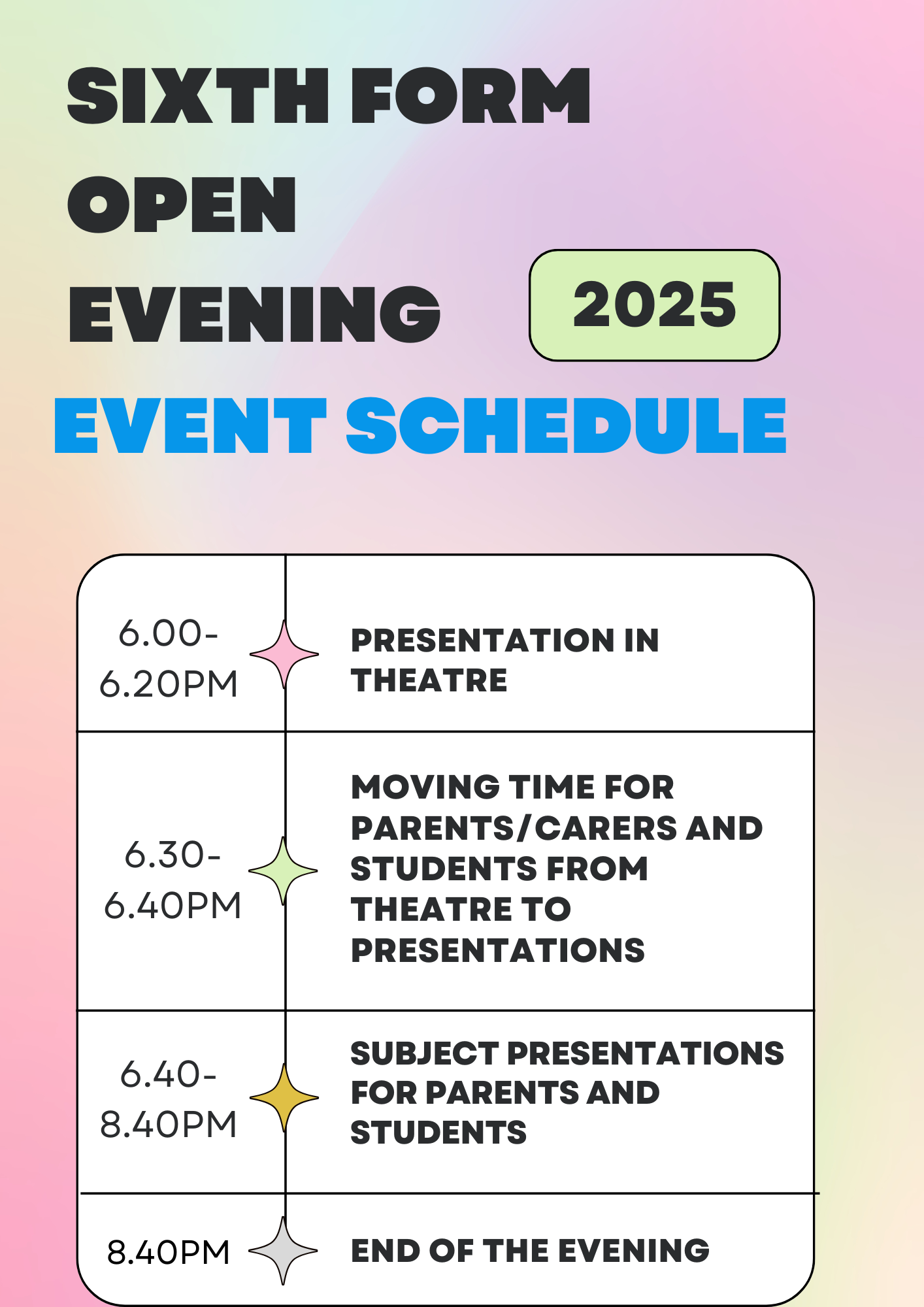 Among many things to look forward to this term, one of the most exciting events on the horizon is our Sixth Form Open Evening at the end of November. We are very much looking forward to seeing Year 11 students and their families in school for this event on Thursday 27th November 2025. There is no need to register for this event in advance.